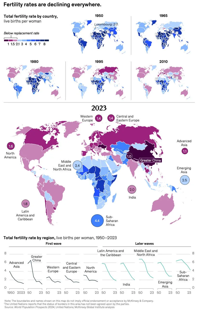 Os mercados emergentes são um misto. Índia, Indonésia, partes da América Latina e África ainda têm populações jovens e em expansão – por enquanto. A história do crescimento do consumidor ainda é credível aqui, pelo menos temporariamente. Mas não fique muito confortável: as taxas de fertilidade estão a cair ainda mais rapidamente nos mercados emergentes do que alguma vez o fizeram nos países desenvolvidos. A força de trabalho da China já está a encolher; a taxa de fertilidade do Brasil já está abaixo do nível de reposição; a da Índia também está a cair.